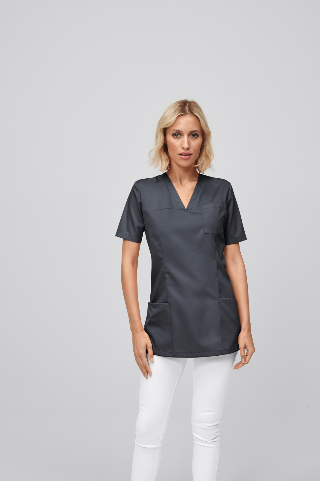 Der Schlupf-Kasack mit Teilungsnaht und Abnähern vorne und hinten sorgt für eine figurbetonte Passform. Der V-Ausschnitt ermöglicht ein müheloses An- und Ausziehen. 1 aufgesetzte Brust- und 2 aufgesetzte Taschen bieten Platz für wichtige Utensilien. Bequeme Seitenschlitze sorgen für eine optimale Bewegungsfreiheit. • Rückenlänge Gr. S ca. 71 cm. |
